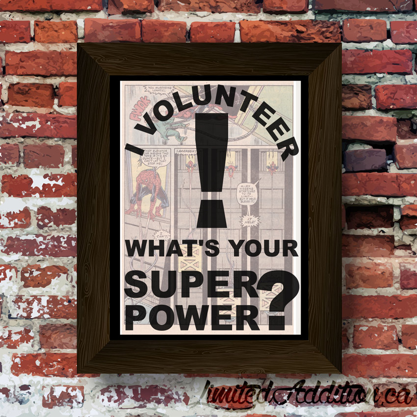 Volunteer - What's Your Super Power quote Super Hero Upcycled vintage comic book art print. #0064